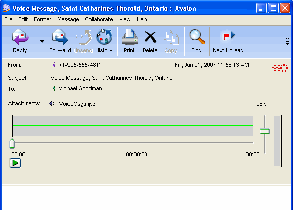 A voice message is received as a FirstClass message with a .wav file attachment. The first time you open the message, the attachment will play automatically.